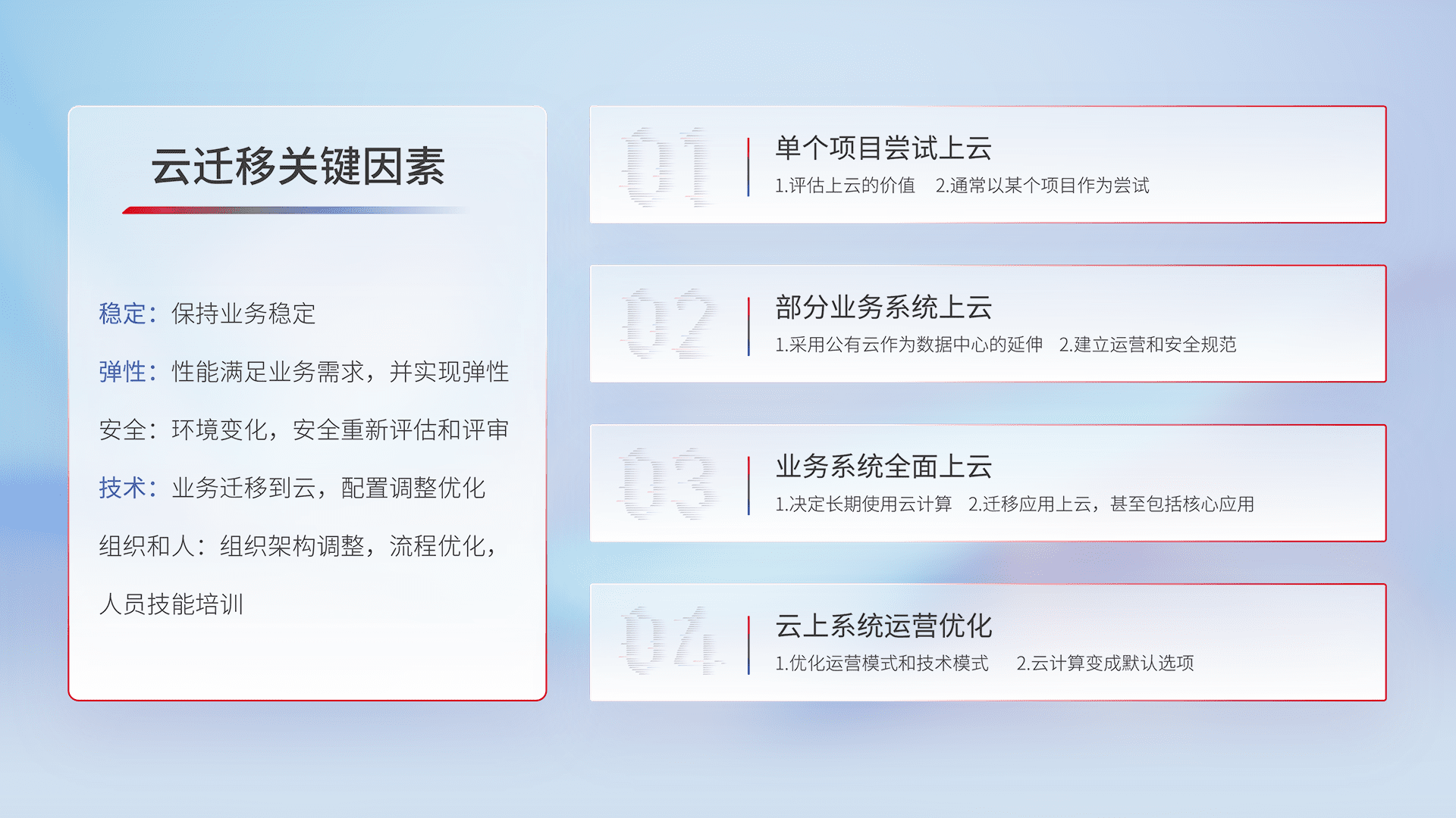 结合实际业务,,从规划设计、、、、云平台选型、、云原生改造、、数据迁移、、、、集成交付,,,迁移全过程为客户识别最佳上云路径,,,做好风险识别管理,,,设计网络架构、、、身份权限、、安全审计合规、、、操作审计、、日志审计、、监控告警策略、、、多站点容灾设计等,,,,对云上基础设施进行整体规划,,提升IT治理水平,,,以满足弹性、、高可用、、、、高性能的需求。。