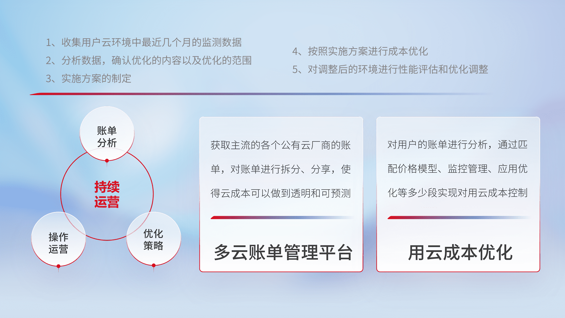 通过多云纳管,,,以统一的资源数据模型把客户的云资源进行抽象和封装,,,,进而实现对多云资源的统一操作,,,保障云资源管理的可靠性、、稳定性与可用性。。。量身定制化运维内容,,,,配置、、、、开发运维、、补丁管理、、、备份、、、监控、、认证和访问管理、、、审计和日常巡检等,,,,保障在用云过程中的可靠度,,,稳定度以及高可用率。。。