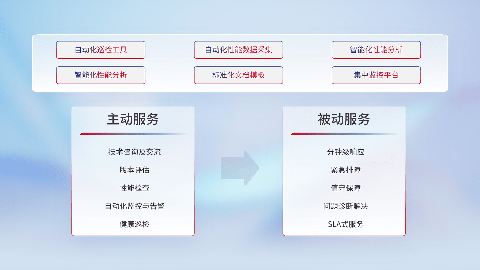 智能化工具和标准化文档,,保障服务质量,,提供主动服务(包含技术咨询、、、、版本评估、、、性能检查、、、、自动化监控与告警、、、健康巡检)和被动服务包含(分钟级响应、、、紧急排障、、、值守保障、、、问题诊断解决、、、SLA服务)。。